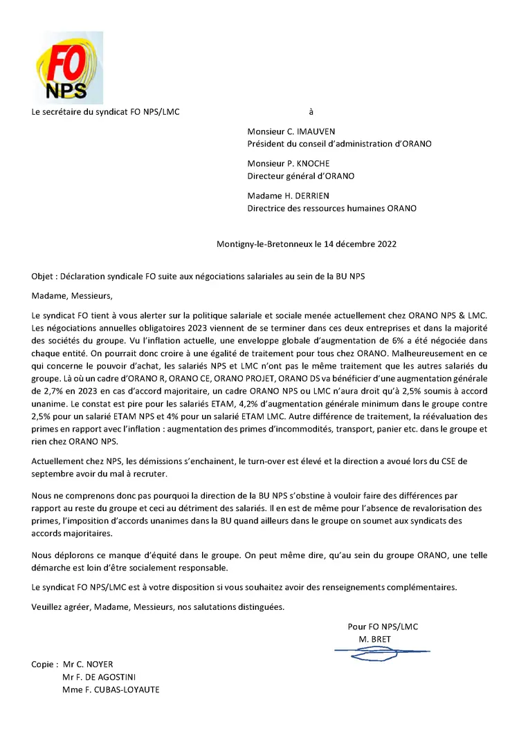 Lettre FO NPS/LMC à Mr C.IMAUVEN Mr P.KNOCHE et Mme H.DERRIEN suite aux négociations salariales dans la BU NPS